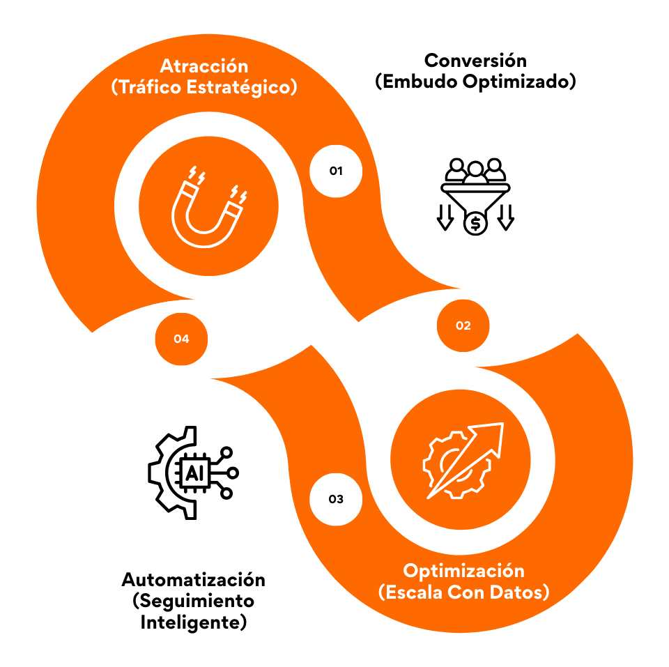 Diseñamos e implementamos sistemas completos de adquisición y conversión, incluyendo estrategia, embudos y automatización.